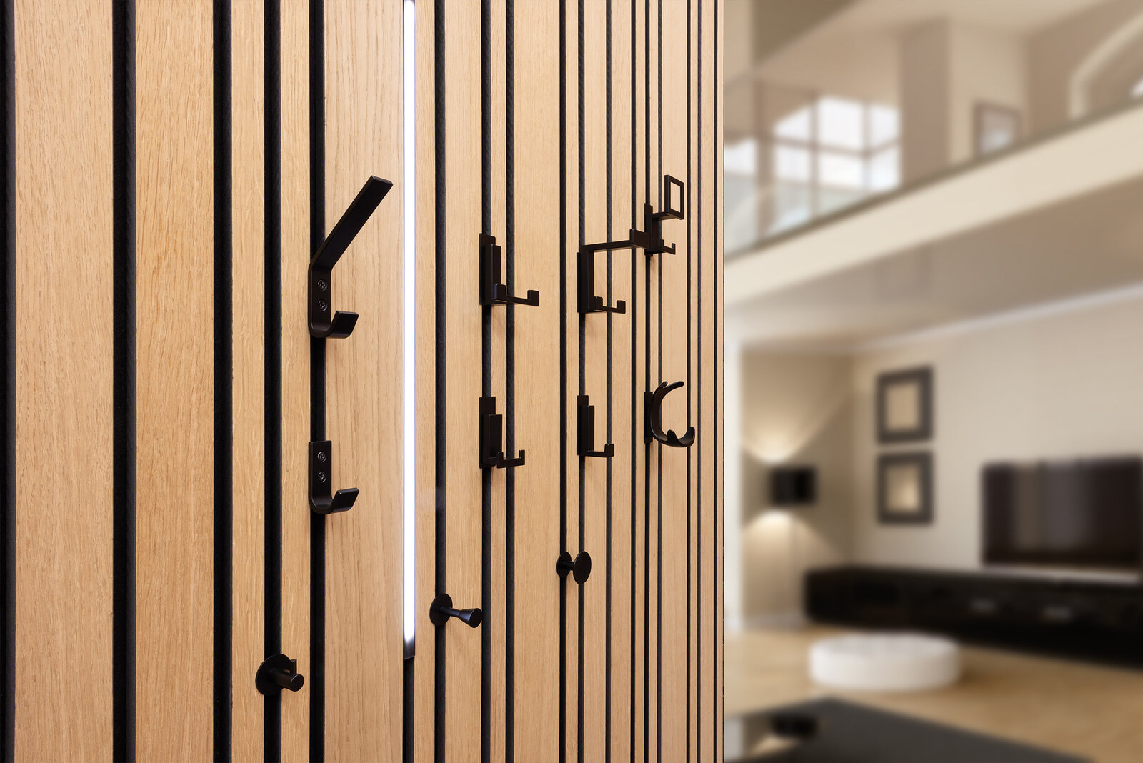 Und weil Funktionalität bei Schachermayer immer mitgedacht wird, gibt es passendes Zubehör, das Design und Nutzen perfekt verbindet. Akustikpaneele lassen sich nicht nur als dekoratives Gestaltungselement einsetzen, sondern auch clever funktional erweitern. Mit Mantelhaken, Huthaken und Hakenleisten aus hochwertigem Zinkdruckguss beziehungsweise Kunststoff in edlem Schwarz entstehen praktische Aufhängemöglichkeiten, die sich optisch harmonisch in die Lamellenstruktur einfügen.