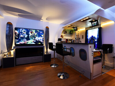 In jedem Winkel des überraschend gemütlichen Wohnzimmers versteckt sich eine neue Finesse. Einzeln steuerbare Screens in den Flugzeugfenstern erwecken den Eindruck, tatsächlich abzuheben, LEDs ahmen die starke Sonneneinstrahlung nach. Ein beleuchtetes Bild hinter der Bar ermöglicht den vermeintlichen Blick in die 2. Klasse. Via eingebauter Soundanlage können Flugzeug-Geräusche imitiert werden, das originale Mikrofon kann für Durchsagen verwendet werden. Die Trolleys hinter der Bar dienen als Stauraum und mobiler Kühlschrank. Gespeist wird gebührend im Kampfjet-Schleudersitz, der aufwendig für die Verwendung auf Parkettboden angepasst wurde, einer der Sitze wiegt immerhin 110 Kilogramm. Die Schleuderfunktion ist nicht mehr aktiv, wäre diese doch auch mehr als unpraktisch.