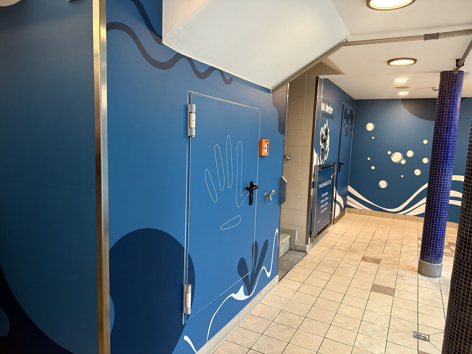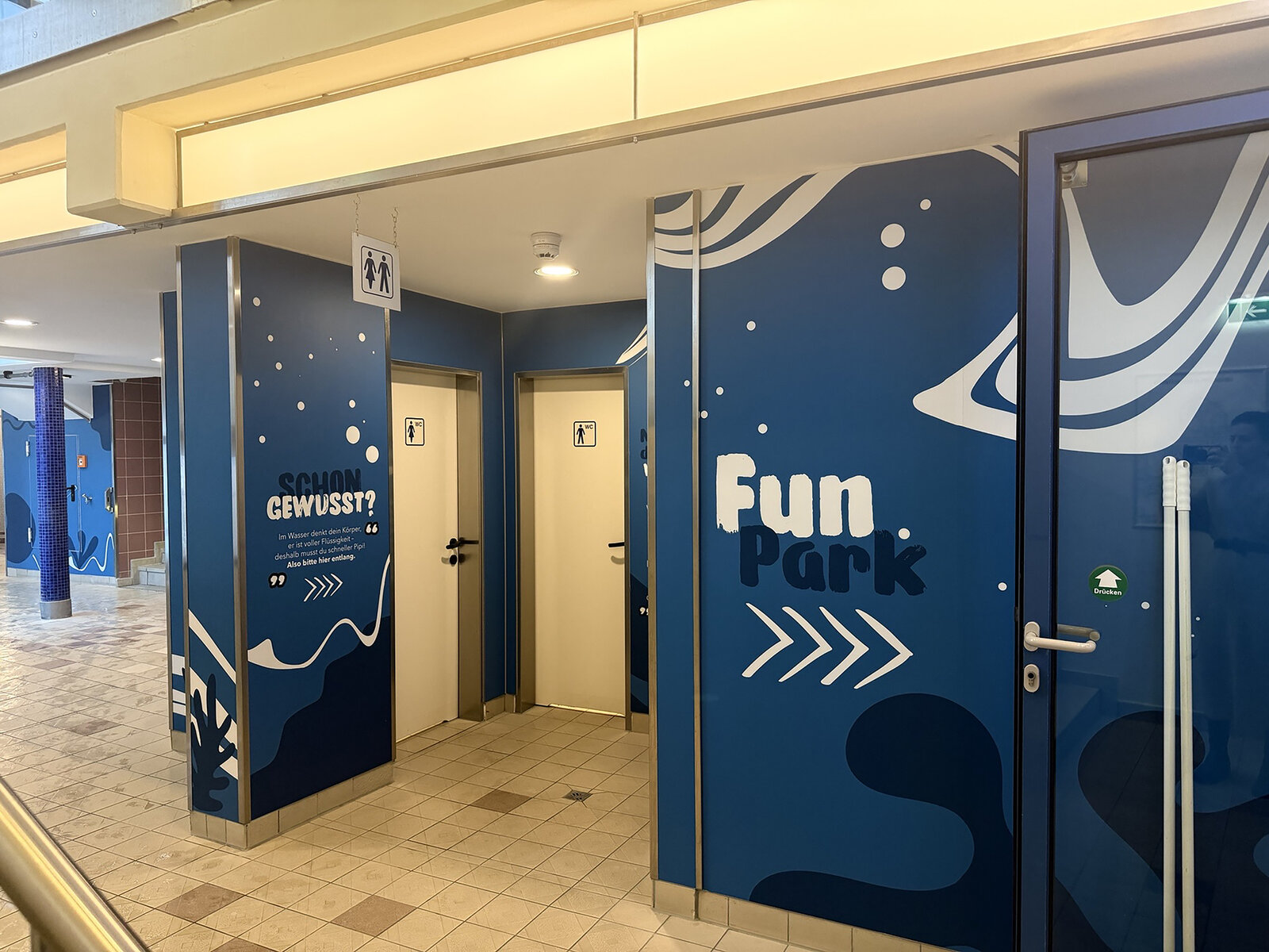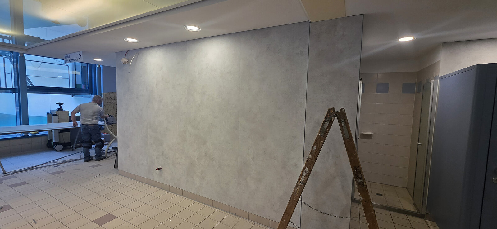 Spannend wurde es im Kinder- und Jugend bereich. Hier ging es nicht nur darum, alte Fliesen zu überdecken, sondern darum, durch den Raum eine neue Geschichte zu erzählen. Die Hydro Wall Platten wurden themenbezogen beklebt oder mit Grafiken bedruckt. Das Ergebnis: Wände, die nicht nur optisch beeindrucken, sondern auch informieren und genau die Zielgruppe abholen, für die sie gemacht sind. Das System spielt dabei gleich in zwei Welten: Während im Erlebnisbereich Motive und Designs für Stimmung sorgen, setzt man in exklusiveren Zonen auf schlichte, unbeklebte Platten – hochwertig, zeitlos, elegant. So wird aus einem Sanierungsprodukt plötzlich ein echtes Gestaltungselement.