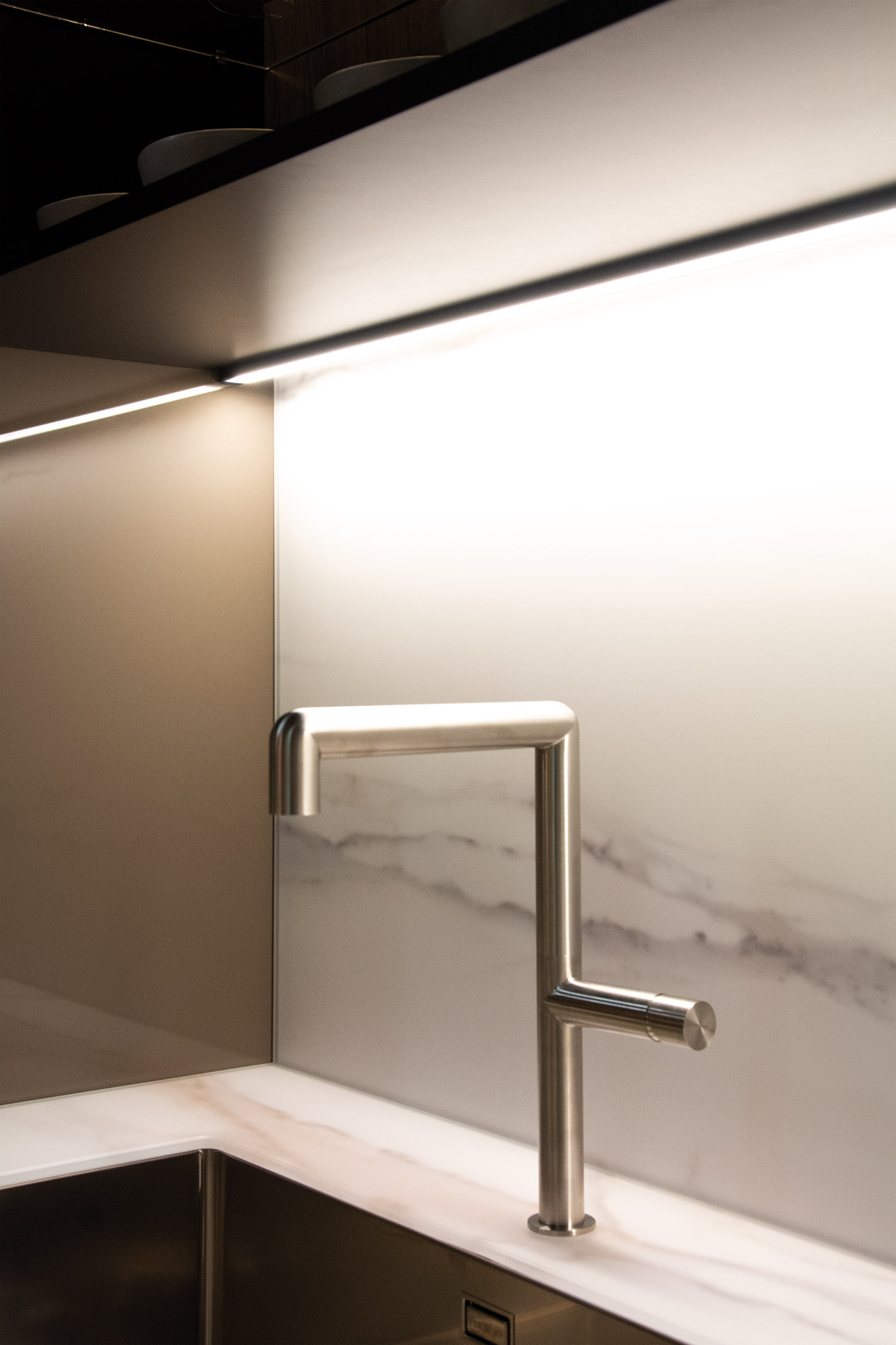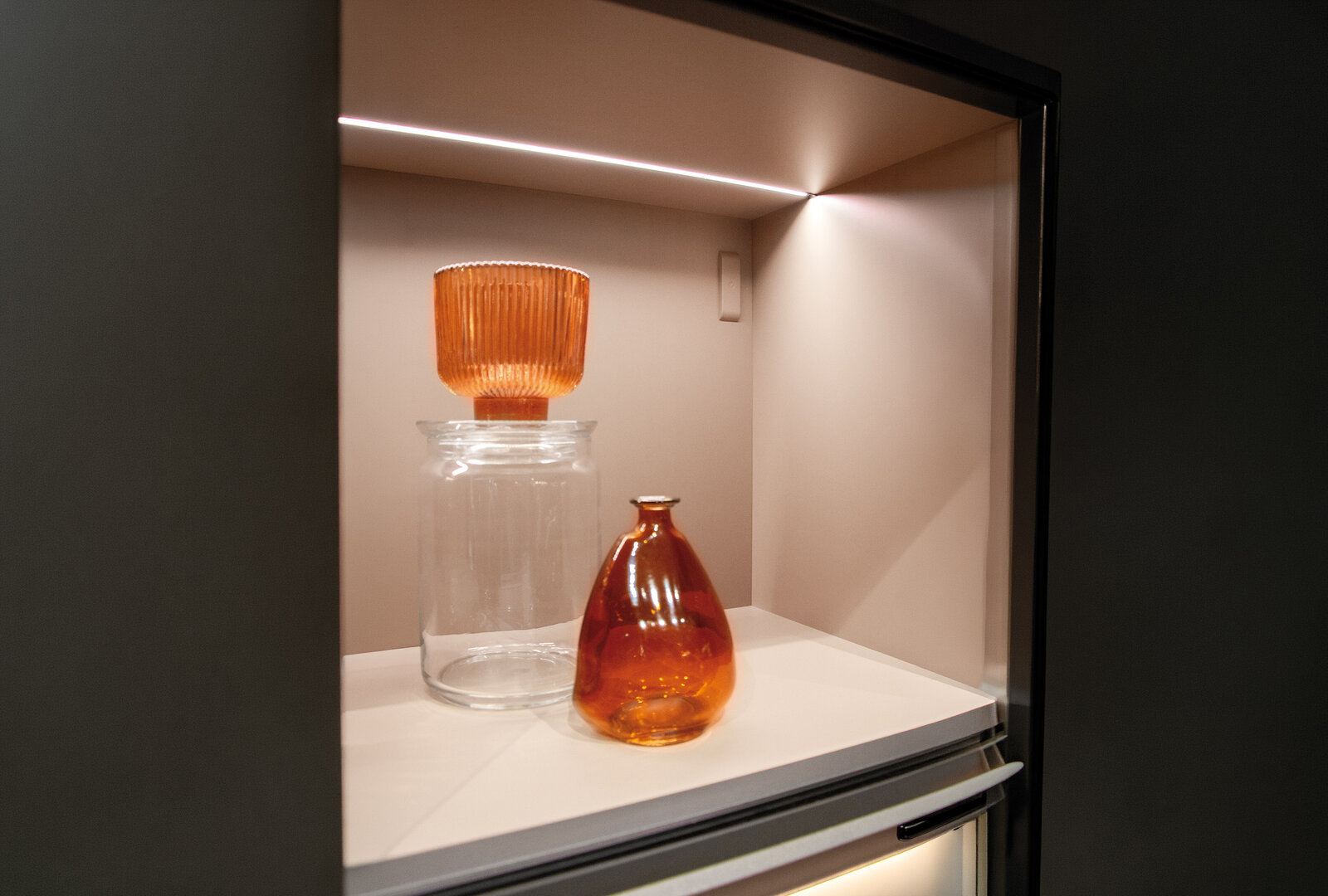 Viele Lichtlösungen scheitern an Details: Das Band muss geklebt werden, der Zuschnitt passt nicht, es entstehen dunkle Zonen. Moove vom italienischen Lichtspezialisten L&S ist ein Aluminiumprofil mit integriertem LED-Band und löst genau diese Probleme. Sie müssen kein LED-Band mehr einkleben. Sie kürzen das Profil auf den Millimeter oder Sie bestellen es gleich auf Maß. Damit passt die Leuchte exakt in die Nische, ins Regal oder unter den Korpus. Anschlussleitungen, Verbinder und verschiedene Schalter funktionieren als Plug and Play. Sie brauchen keine Sonderlösungen am Montageort.