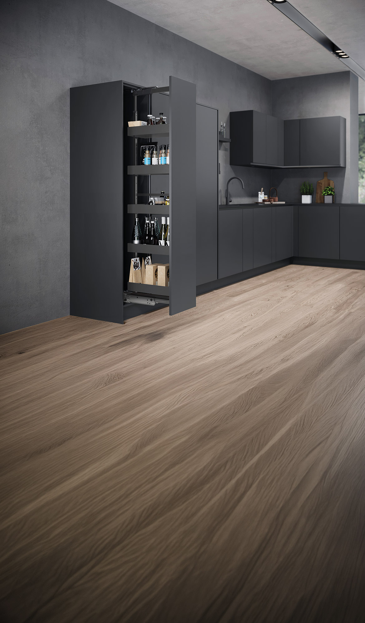 Stauraum ist heute Teil des Designs. Man öffnet Schränke und sieht das Innenleben. Genau dort spielt Essentio seine Stärken aus.Die Serie besteht aus abgekantetem Stahlblech. Die Flächen sind geschlossen, die Linien ruhig, der Look monochrom. Das wirkt hochwertig und reduziert. Essentio passt damit gut zu modernen Küchen, Garderoben, Bädern und Wohnmöbeln. Essentio ist dünnwandig, somit gewinnen Sie Platz im Korpus. Das ist spürbar, vor allem in schmalen Auszügen oder bei hoher Beladung. Eine filigrane Metallreling sorgt für klare Führung. Eine Antirutschmatte ist dabei. Das hält Inhalte ruhig, auch bei Vollauszug und schnellen Bewegungen. Sie können Essentio als Innenorganisation in Auszügen und Schränken nutzen, wenn Ihre Kunden ein ruhiges, einheitliches Design möchten. Gute Einsatzbereiche sind Küchen, Hauswirtschaftsräume, Badmöbel, Garderoben sowie offene Stauraummöbel. Essentio entfaltet seine Wirkung besonders dann, wenn der gewählte Look konsequent über das gesamte Möbel hinweg geführt wird. Wird derselbe Material- und Farbcharakter innen wie außen eingesetzt, entsteht ein ruhiges, stimmiges Gesamtbild.
